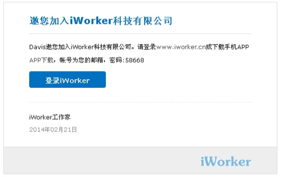 XXX邀您加入XXX公司。请登录 www.iworker.cn或下载手机APP t.cn/8k9t6LI ,帐号为您的手机号,密码:47982【工作家】