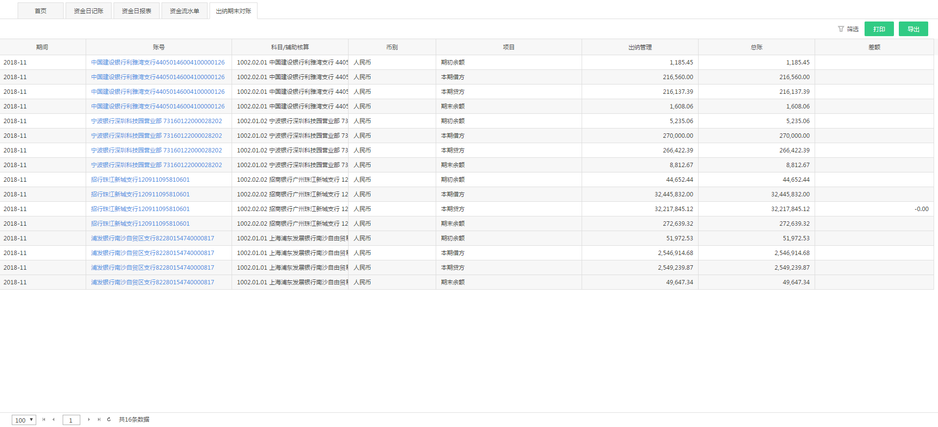系统提供出纳期末对账功能,用户可查询某会计期间范围内出纳管理、总账,以账号为维度,统计各币别的期初余额、本期借方、本期贷方和期末余额。