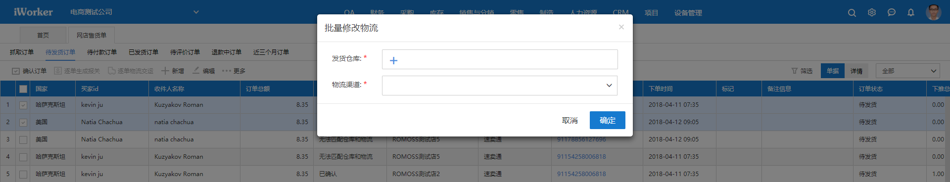网店售货单导入或新增后,可以点击“批量修改物流”,对多张订单的发货仓库和物流渠道进行修改。