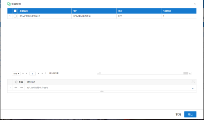 在物料清单列表界面,点击“更多-批量复制”,进入批量复制界面,在界面上方选择需要被复制物料清单的商品,在界面下的应用于父项商品的表体中选择需要使用相同物料清单的商品,点击“发送”,完成批量复制操作,新增的商品物料清单单据状态为暂存,可以进行修改。