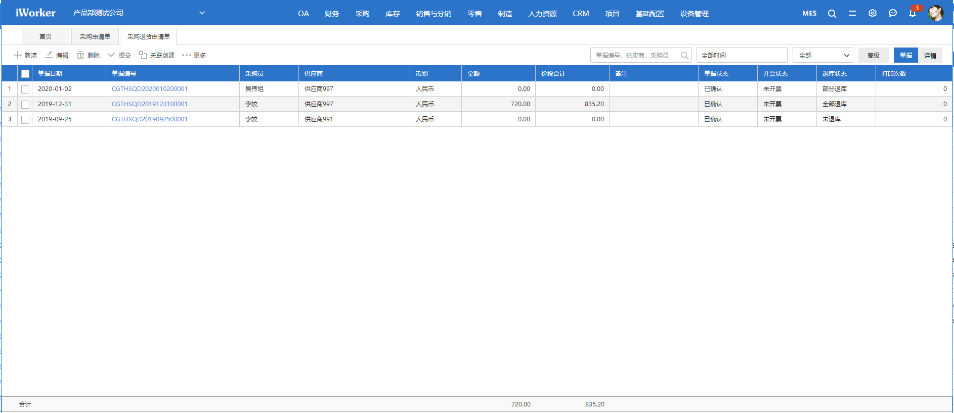 采购退货申请单可下推采购发票、采购退库单等;同时在采购退货申请单列表即可查询采购退货申请单的单据状态、开票状态以及退库状态等。