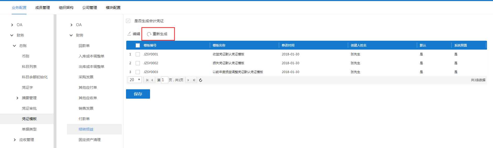 系统会自动生成结转损益凭证,用户如果重新设置了科目列表,则需要重新生成。进入【业务配置-财务-总账-凭证模板-结转损益】,点击“重新生成”,系统会根据科目列表更新结转损益凭证模板。