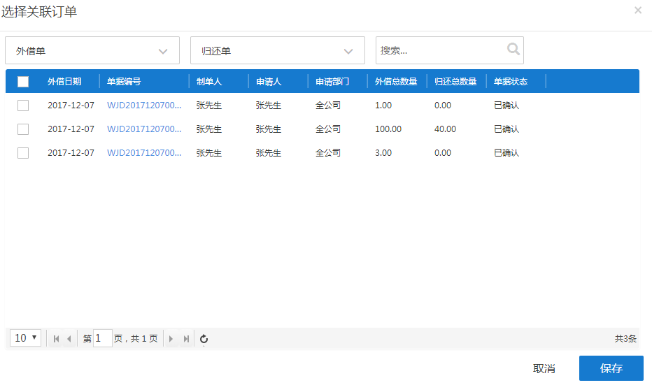 用户选择关联订单之后,外借仓库等信息携带出来。归还数量默认=外借数量,用户可以编辑。