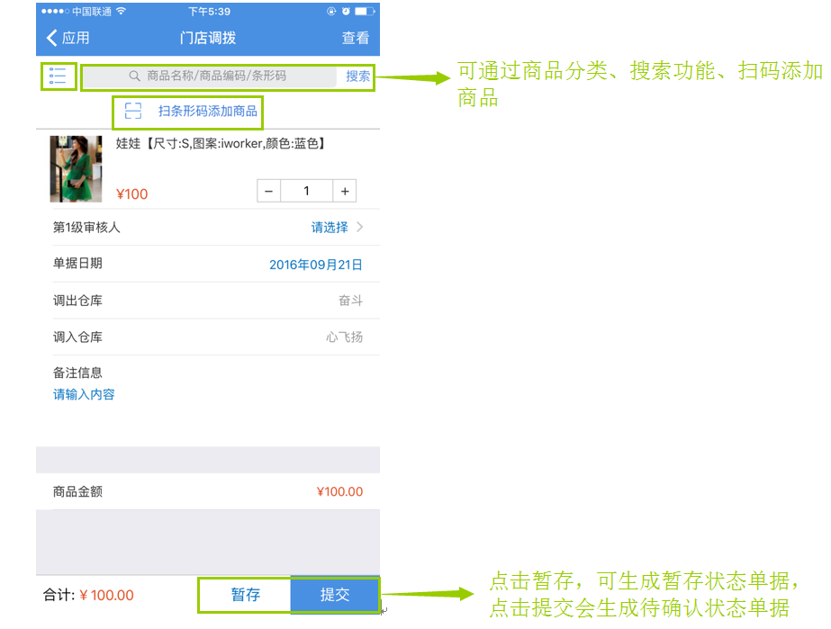 用户也可通过移动端发起调拨单,登陆移动端后,在应用界面点击【门店调拨】,即可进入调拨单发起界面