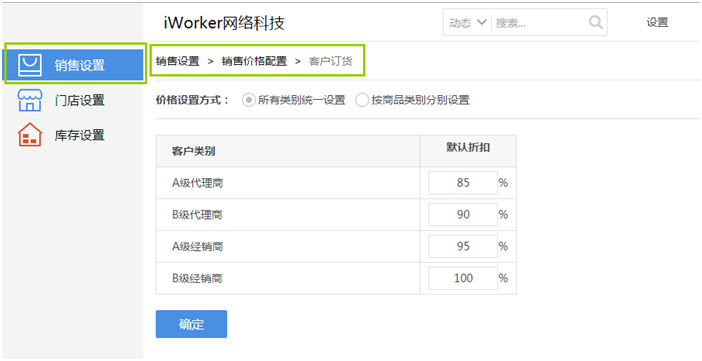 在【销售设置-销售价格配置】界面,可以对商品所有类别统一设置,选择选择【所有类别统一设置】后,所有商品对下面类型的客户都会显示折扣后的价格。