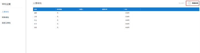 点击“新建审批”,用户用户可以对系统固定审批和自定义审批配置控制参数,管理员可设置审核级次,最少级次为1级,最大级次为10级,每级可设置审核人为直接上级、间接上级或指定人员。